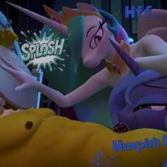 Chikkin gives up way before Audra who manages to get 6 in her mouth and wins the prize of a whole bag dumped over her head. The ladies decide it would be cute to give one another some war paint and make up silly names for themselves. Audra has Chikkin bend over and dumps sprinkles all over her butt in slow motion. Back to normal speed she empties the rest onto her, and then Chikkin gets a chance to return the favor in normal speed and slow motion before they both shake their asses and send the sprinkles flying. They press their boobs together and continue the sprinkle coating. We get another slow motion scene of them spitting the sprinkle beads at one another too. Cupcake time is next and I have the ladies assume the position on their knees facing away. I nail them with several cupcakes in all the important targets. There's even some slow motion impacts. Audra delivers Chikkin's facial with the condensed milk, Chikkin then gets her right back and covers her face and on her boobs. We wrap up with them face to face putting a pie on the other in slow motion, then Chikkin eats some pie off of her face.
