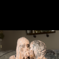 Anybody who was in scouts will appreciate the game of chubby bunny we play. It gets a little more shiny as we pull out the sprinkles, and then we go for some pudding action. Moving into fruits, a can of apple pie filling is opened and dispensed over their head, and down the back. The next step is some interactivity. My cupcake aim proved pretty decent, as I landed a number of shots on target. Slow motion is used for a couple of shots to really convey the impact. The cupcake launcher is used for a few shots, and then we wrap up with the traditional condensed milk facial.